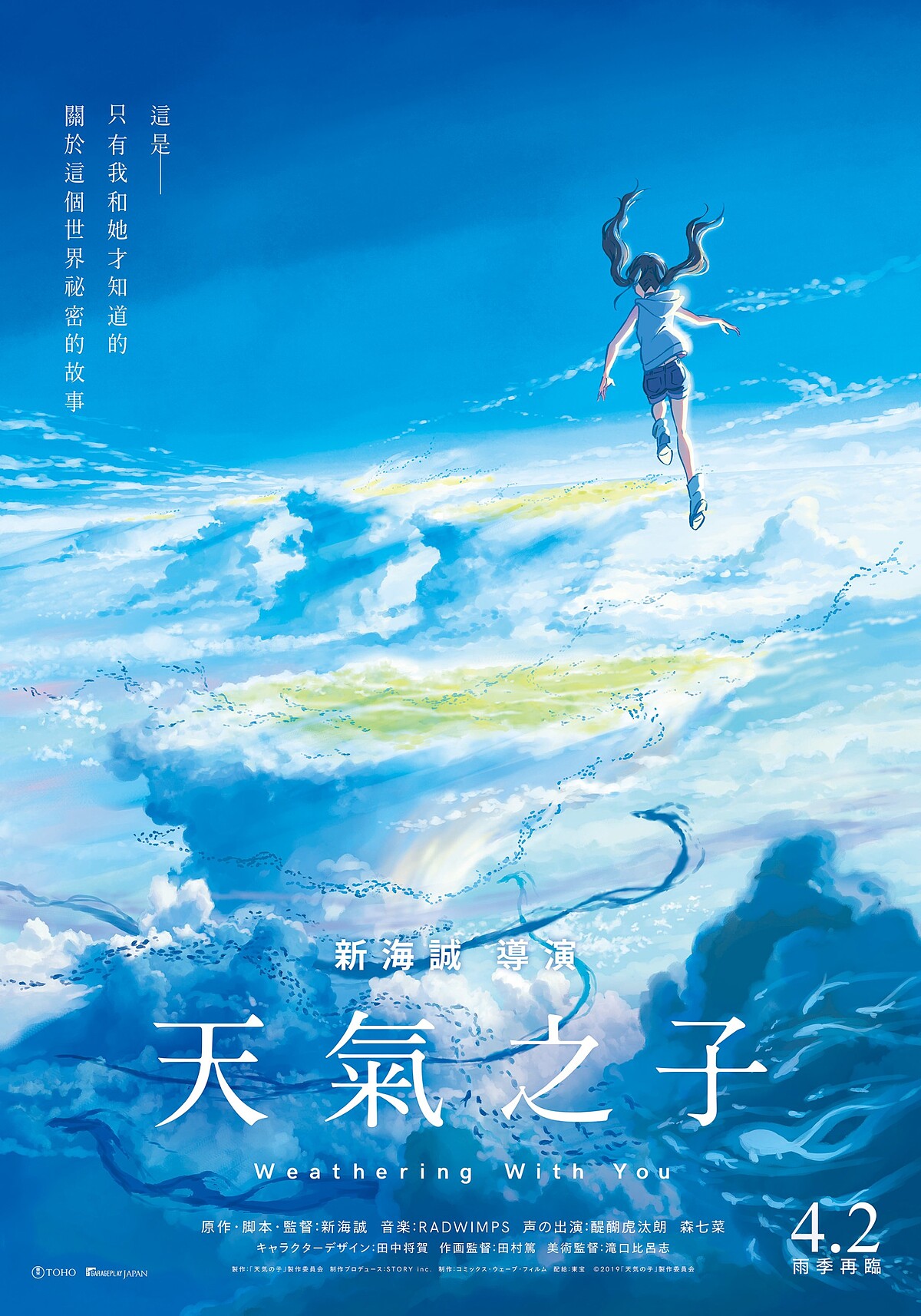 《天氣之子》當年在台上映也賣破1.6億台幣,男主角「帆高」和女主角「陽菜」,分別由日本男星醍醐虎汰朗和日本女星森七菜擔綱配音,兩人是透過甄選得到角色。關於聲優的選擇,新海誠表示:「現在回想起來,只有這兩位演員才能勝任這兩個角色,但當初在抉擇時真的很苦惱,雖然也有其他幾位有力人選,但最後考量到兩人的平衡和配合是最重要的。」