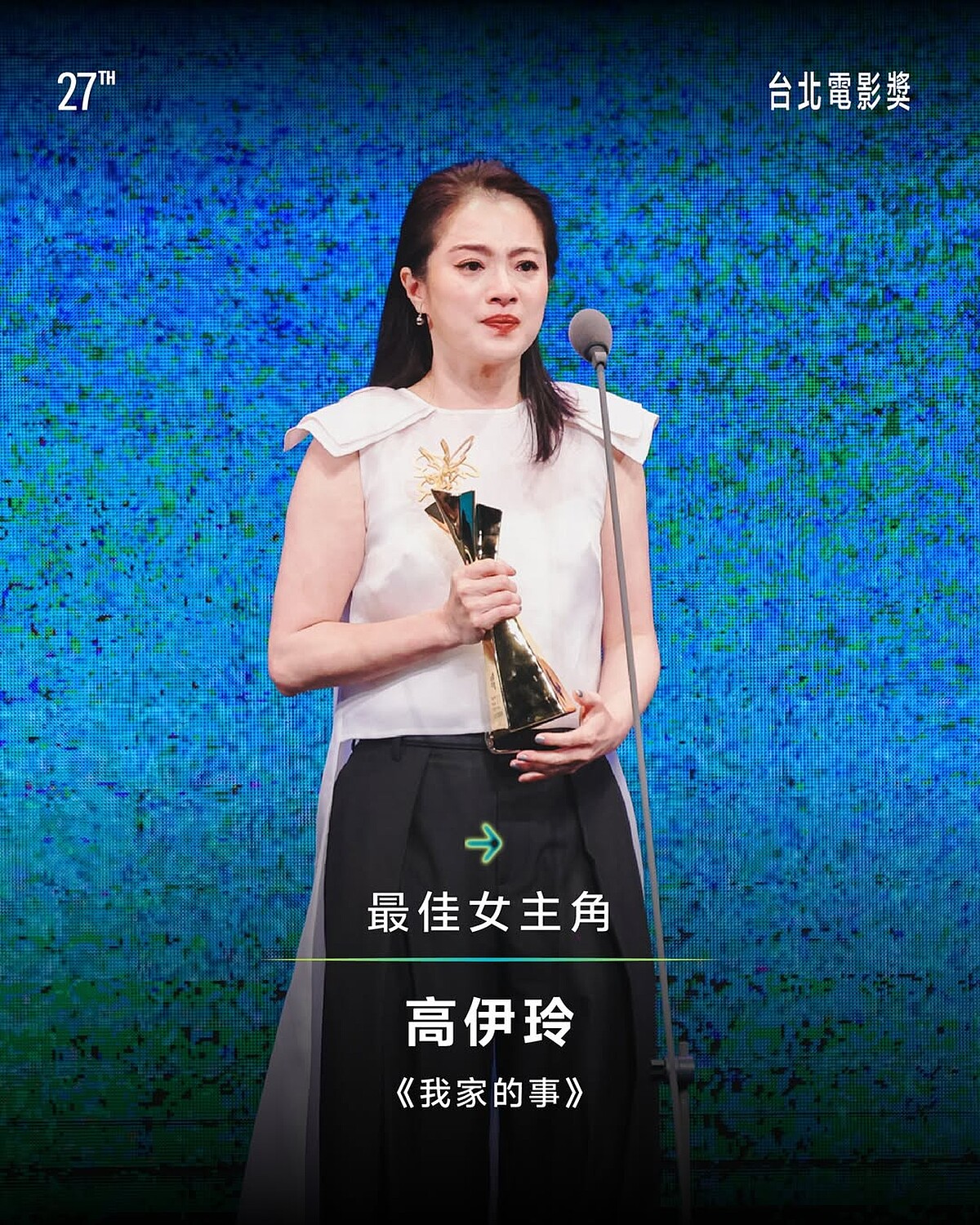 而最佳女主角則是頒給了《我家的事》高伊玲,入行30年,從廣告、模特兒起家,也拍過不少信,近年決定回歸所愛,把9成演藝工作的比重放在演員,如今開花結果,在《我家的事》細膩詮釋台灣傳統母親的壓抑、隱忍與內心糾結,首次勇奪北影影后。她領獎時特別感謝全天下的母親以及代理母職者:「謝謝你們為了維護家庭,努力付出而放棄了許多,謝謝我的生命中每一個讓我感受到溫暖母愛的人們。」