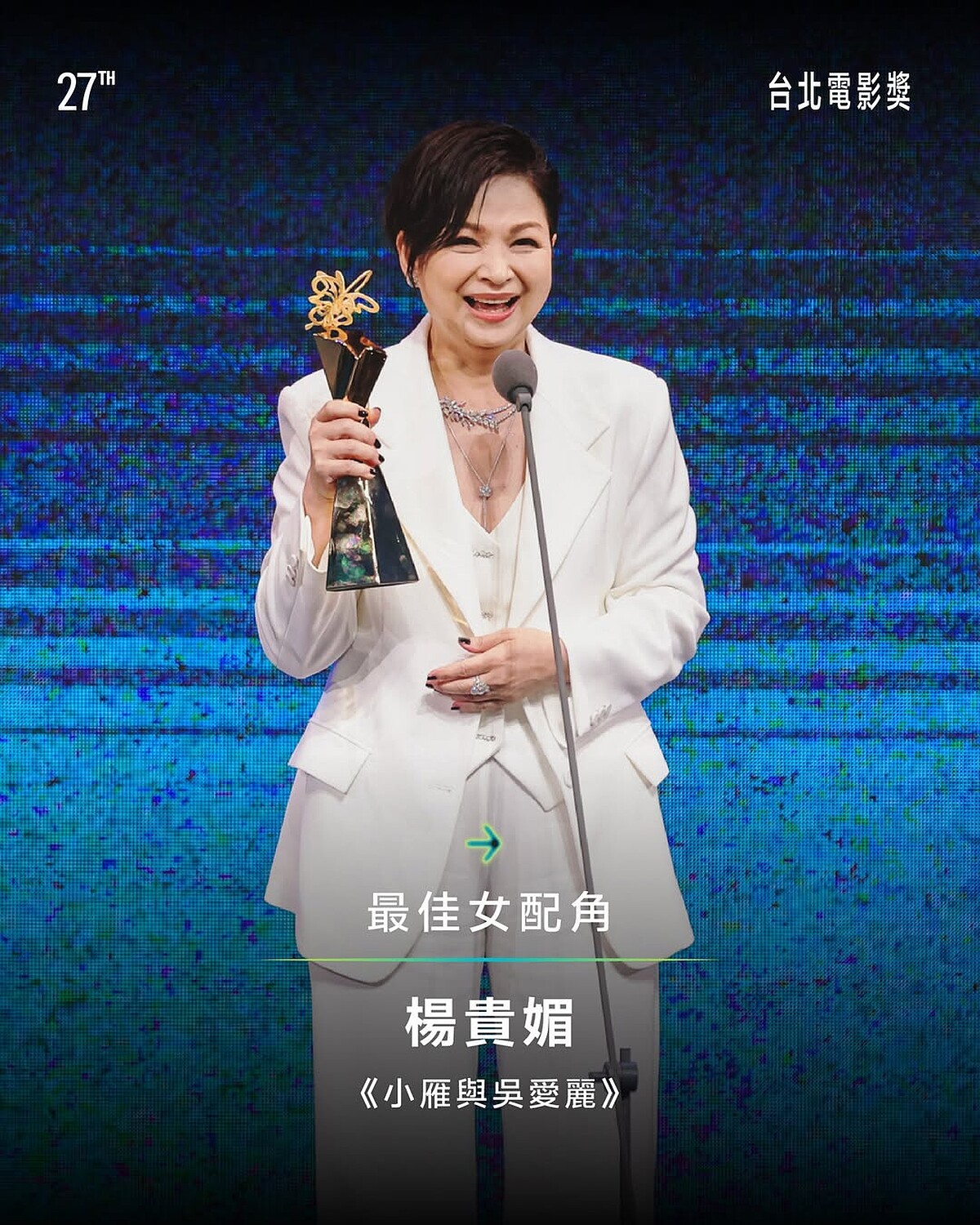 楊貴媚去年以同部片奪金馬女配,如今北影再拿一座,她開心說:「謝謝你們從吳愛麗看見楊貴媚,謝謝導演林書宇給我一個這麼難得的角色,雖然她很詭異但我很喜歡。」