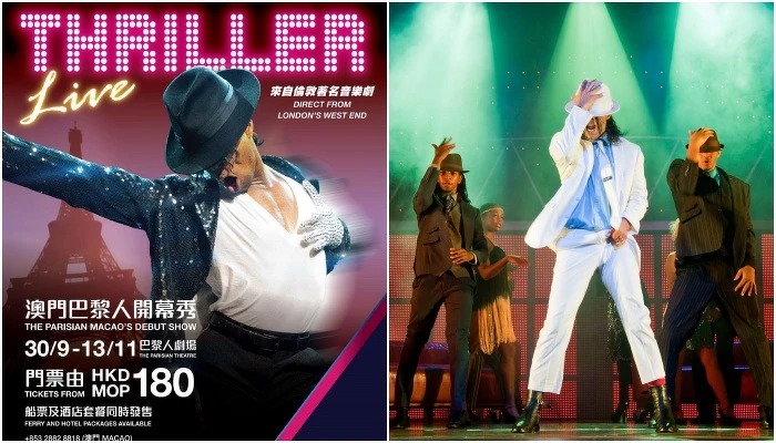 在國際間的歌壇上,麥可傑克森無人可取代!來自倫敦著名的音樂劇THRILLER LIVE,將在新落成的澳門巴黎人劇場上演這位音樂巨星精彩人生的音樂劇,這將是一趟兼具流行、搖滾、靈魂以及帶有「迪斯可」元素的音樂視聽之旅。並於2016年9月30日到11月13日在澳門巴黎人劇場限時演出。