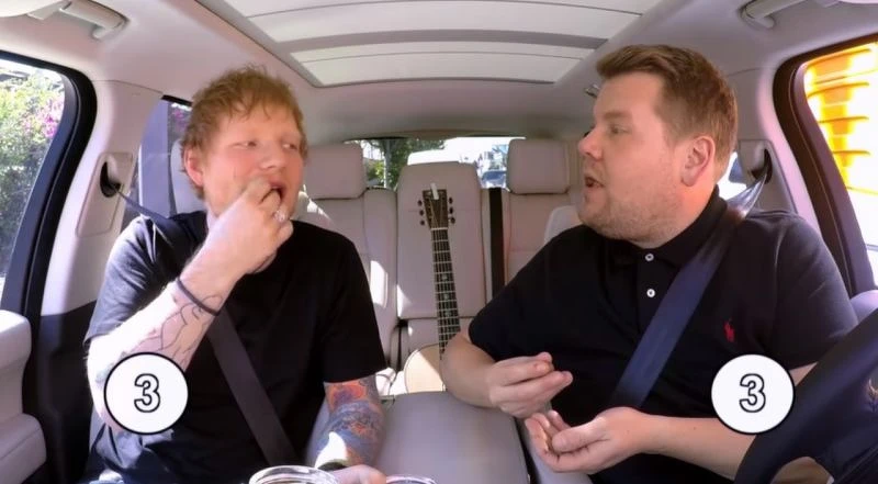 即將在今年開啟亞洲巡迴演唱會的他,先被詹姆斯柯登找來上節目了,一上車便開唱新專輯<Shape Of You>,兩人搭唱搞笑的默契真的太嗨了。詹姆斯突然問起Ed可以在嘴裡塞滿食物的極限,沒想到就真的拿出一盒巧克力球開始比賽,到第26顆時詹姆斯就忍不住吐出來了,而Ed竟然塞到55顆巧克力球在嘴裡,完全笑翻大家。