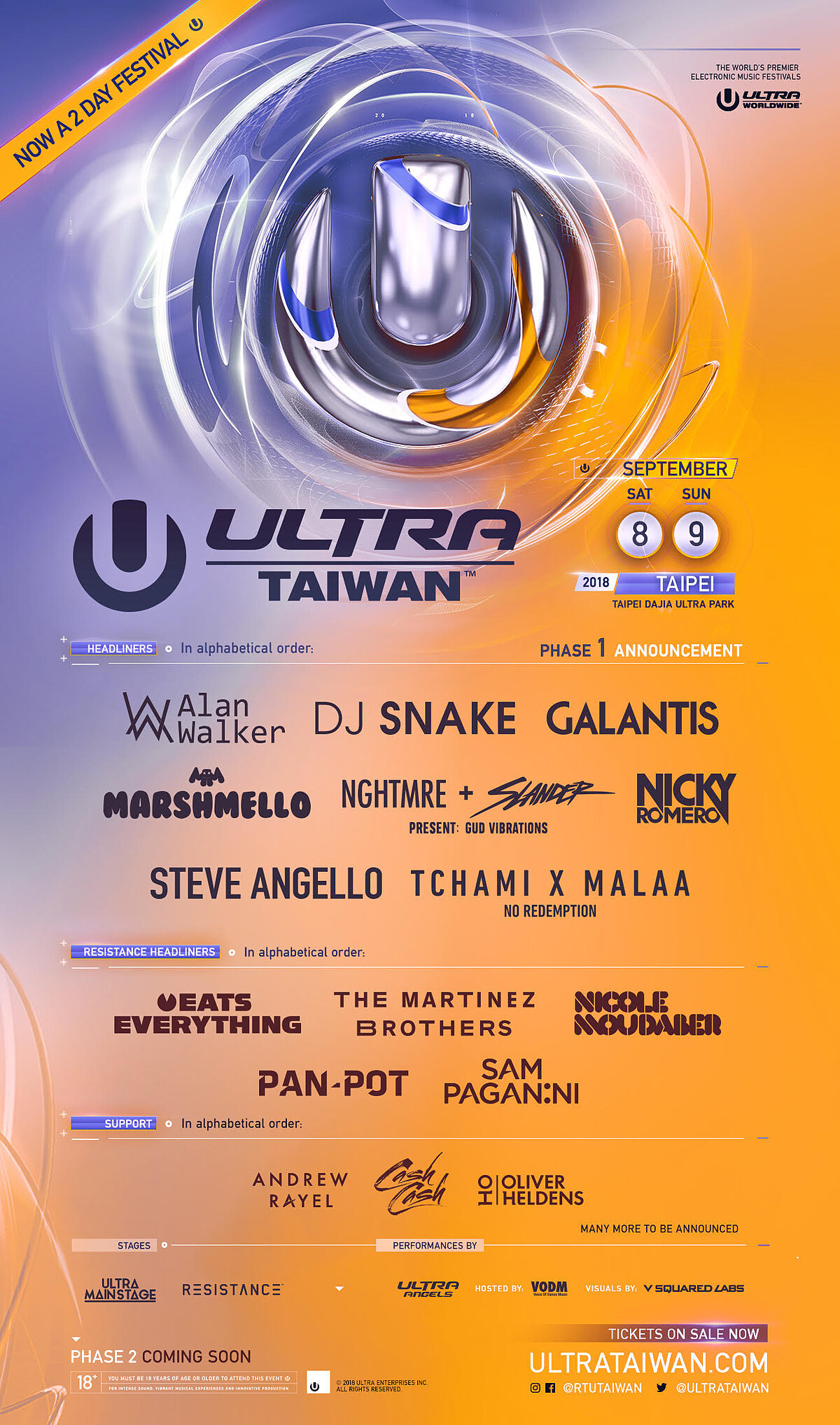 而從Road to Ultra Taiwan升級為Ultra Music Festival的最大看點,除了擁有超強規模的派對,更多了以TECHNO曲風為主的RESISTANCE舞台,號召眾多參加過世界各大音樂盛典的頂級DJ齊聚在這,還有官方音樂節的固定御用DJ,一起重拍震翻豪華的兩天!ULTRA Taiwan 2018第一波陣容如下(依字母順序排列): Alan Walker、Andrew Rayel、Cash Cash、DJ Snake、Eats Everything、GALANTIS、Gud Vibrations(NGHTMRE & Slander)、Marshmello、Nicky Romero、Nicole Moudaber、No Redemption(Tchami & Malaa)、Oliver Heldens、Pan-Pot、Sam Paganini、Steve Angello、The Martinez Brothers。