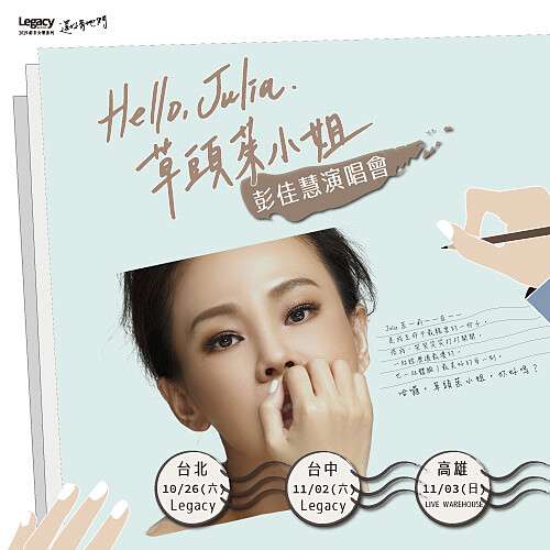 年年集結各大歌后,場場熱銷的Legacy 「都市女聲」系列演唱會,金曲歌后彭佳慧個唱資訊全面公開,將在「都市女聲」回顧樂壇一路走來心路歷程,以精選歌單與樂迷分享出道前、出道後以及現在的自我。柔情鐵肺歌后彭佳慧《Hello,Julia.草頭茱小姐》巡迴於10/26在Legacy 台北、11/2在Legacy台中、11/3在高雄LIVE WAREHOUSE開唱,iNDIEVOX售票網與全台ibon機台皆可購票!
