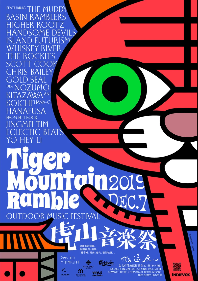 2019虎山音樂祭海報由甫得今年葛萊美獎最佳專輯包裝設計提名的「洋蔥設計」操刀。從網路上瘋傳的「跌破眼鏡貓咪」迷因發想,主視覺是一隻「跌破眼鏡的老虎」,近距離睜大雙眼般盯著音樂活動上的人群,好奇這些傢伙在做些什麼有趣的事,由於虎山音樂祭的特色是台式電子花車跟荒廢宮廟舞台,因此在海報設計上,也特地加入廟宇於背景中。遠離城市喧囂,回歸自然,歡迎大家來唱歌、聽音樂、跳舞同歡,體驗這場讓人意猶未盡的冬日戶外派對。