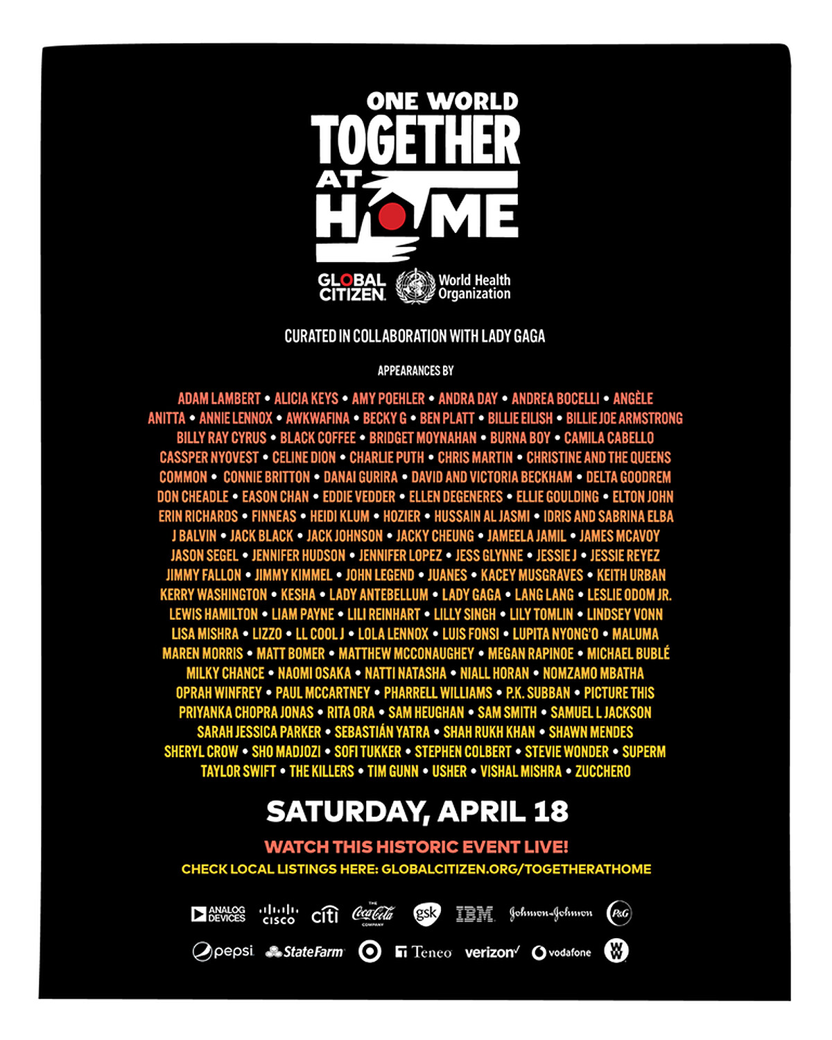 新冠肺炎(武漢肺炎 / CDVID-19)疫情全球仍不斷升溫,為了凝聚全球人民的防疫意識,世界衛生組織WHO與全球公民組織Global Citizen共同發起「#TogetherAtHome」線上音樂活動,更在台灣時間4/19凌晨將會舉辦一場卡司強大到你無法想像的「線上演唱會」,天后女神卡卡、泰勒絲領軍百位明星輪番獻唱,華人陣容則有張學友、陳奕迅加入,實在不容錯過!