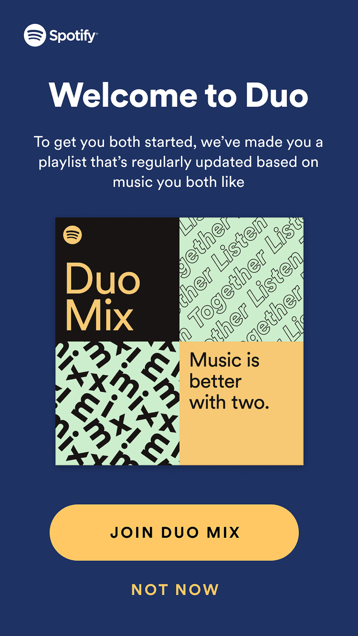使用「Premium Duo」的用戶可以獨家造訪 Duo Mix,一個僅供 Premium Duo 中的兩位訂戶使用、並定期更新的播放列表,盡情發掘他們喜歡的音樂及Podcast。