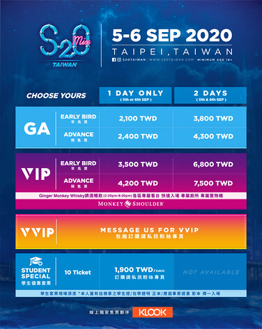 VIP 預售票 單日 NTD $4,200 / 雙日 NTD $7,500(VIP 可享 Ginger Monkey Whisky “SUPER HAPPY HOUR” 調酒暢飲、快速通關入場、各區專屬看台、專屬廁所及置物櫃)