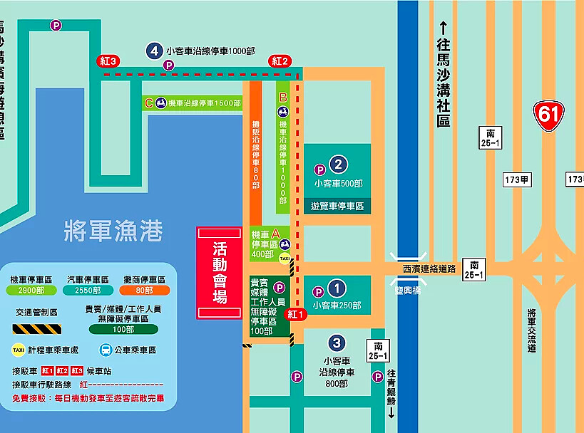 1.南下:新營交流道→鹽水→台19→學甲→縣174→台17→南18→將軍漁港