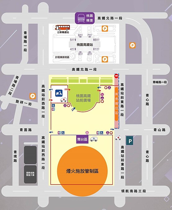 桃園市政府觀光旅遊局要大家謹記「搭機捷、搭公車、少開車」原則,建議搭乘捷運至A18站,走1號出口;搭火車至桃園火車站,轉乘跨年專車-桃園線(紅線)」;開車族則可走國2大竹交流道,接臺31線右轉高鐵站前西路,即可抵達會場。
