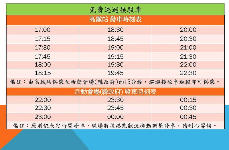 12/31當天早上10點開始實施交通管制,新竹縣政府規劃免費巡迴接駁車,並在活動官網上清楚提供接駁與汽機車停車資訊。倒數完會有6分鐘絢爛煙火秀登場,並有文創市集及胖卡美食,及獨厚竹縣縣民限定的摸彩活動。
