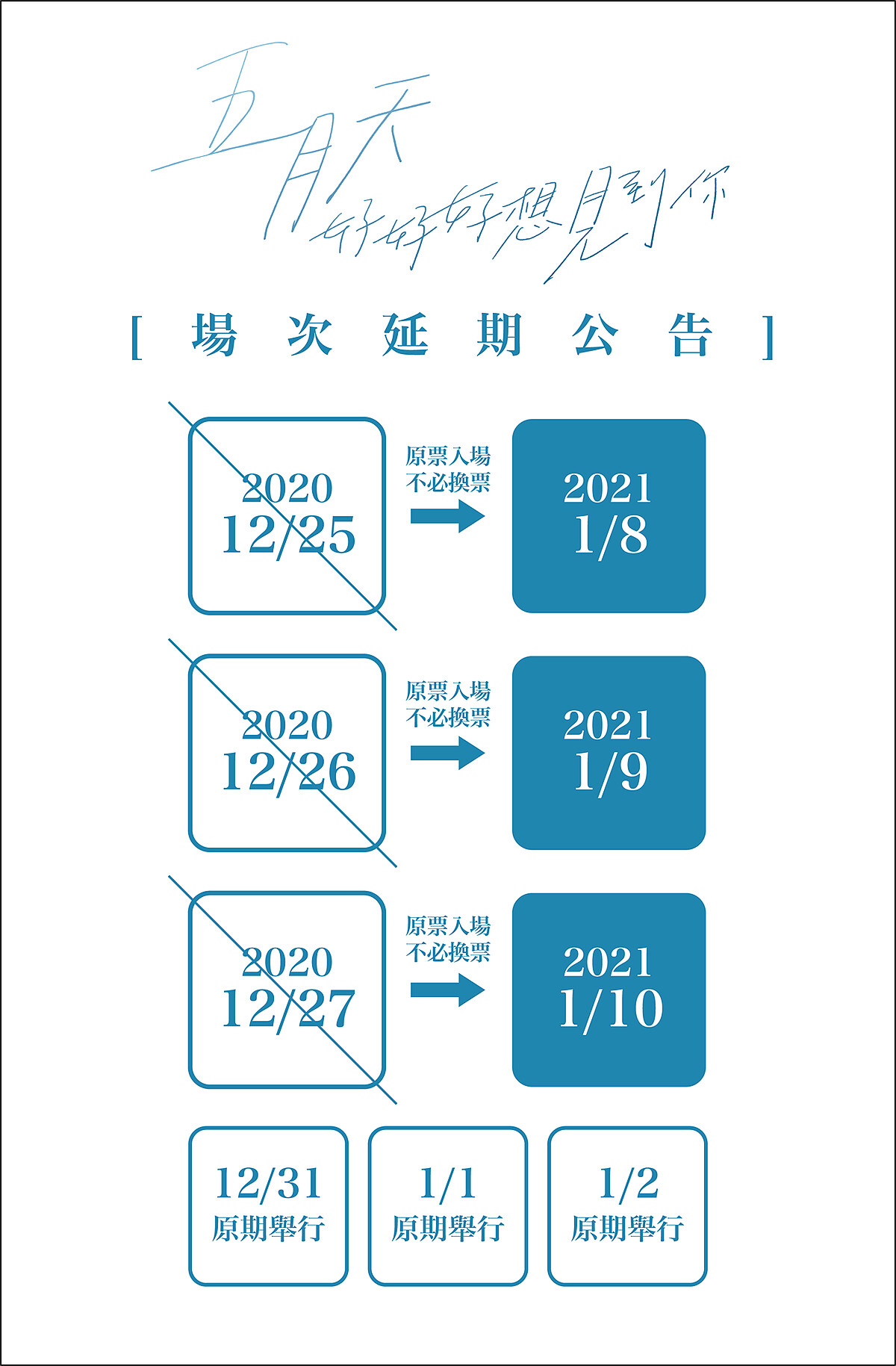 將在北中南巡迴開唱的五月天,「好好好想見到你」Mayday fly to 2021因為疫情關係,緊急宣布延期消息,原訂12/25、12/26、12/27的桃園場將改期至1/8、1/9、1/10,而12/31、1/1、1/2三場將如期舉辦。