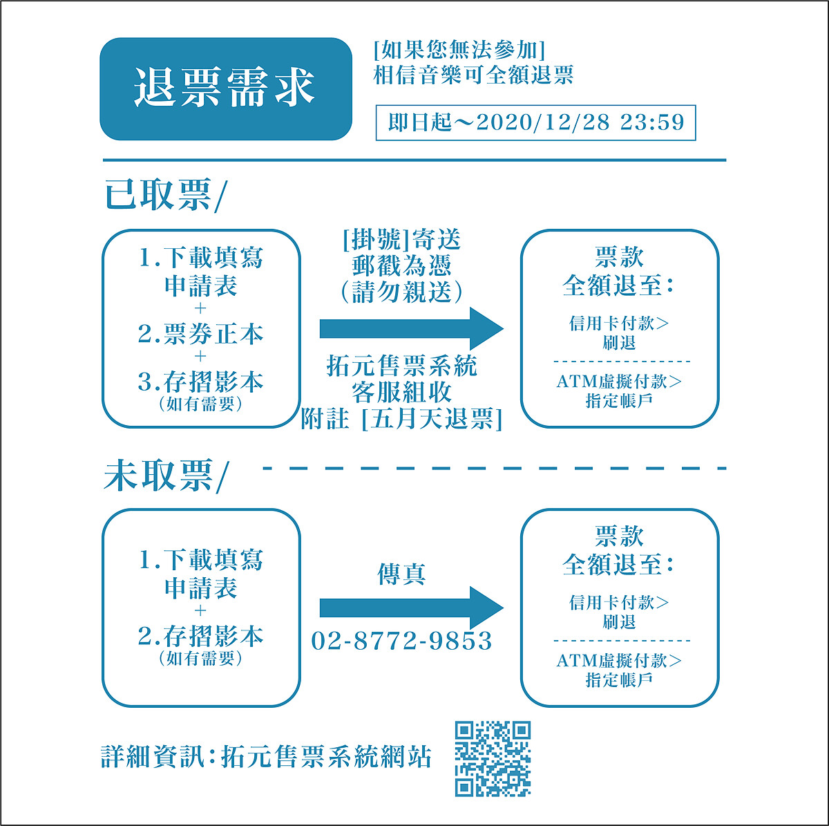 已購票的歌迷朋友「不必換票」可直接憑原票券依座位入場,而需要申請退票的可上拓元售票系統,相信音樂暖心表示:「再多的損失,比不上你們好好的萬無一失,相信音樂與大家共同努力防疫,期待好好的見到好好的你。」