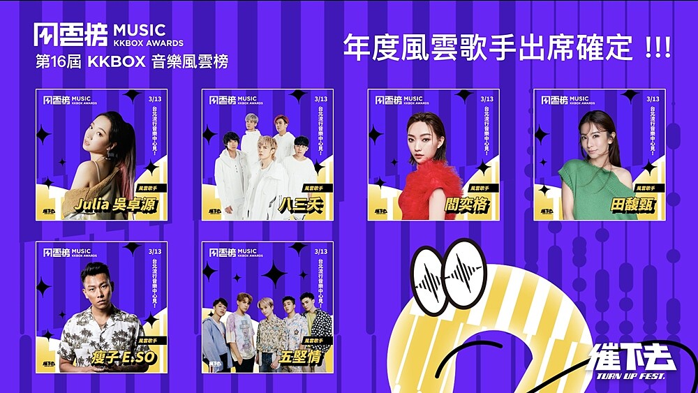 3/13舉辦的音樂風雲榜頒獎典禮,也公布第一波確認出席的本屆年度風雲歌手出席名單,包含八三夭、五堅情、田馥甄、吳卓源、瘦子以及閻奕格。1/27公布風雲榜頒獎典禮表演嘉賓為魏如萱、茄子蛋、告五人、李友廷及Kimberley陳芳語。另外阿冗、周興哲、楊丞琳、鄧紫棋也同為得獎歌手。只要是KKBOX會員,便能在1/18中午12點在「催下去音樂節」活動官網參與索票活動。
