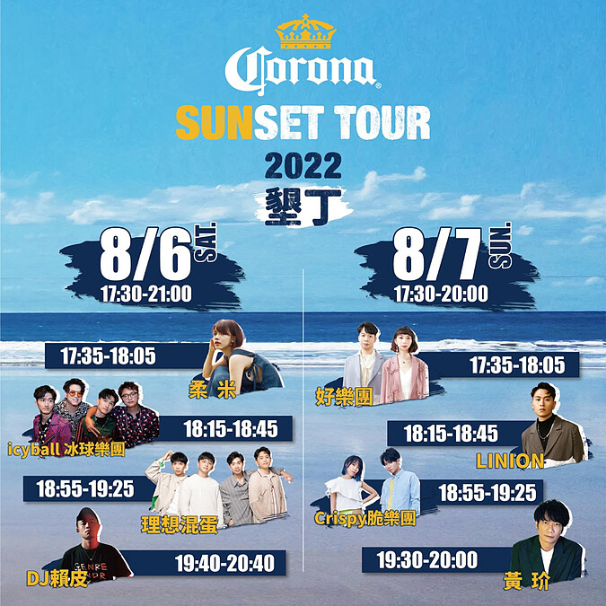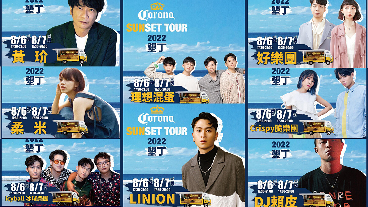 身為主辦方,Corona可樂娜啤酒邀請最8組演出卡司:理想混蛋、icyball冰球樂團、Crispy脆樂團、好樂團、黃玠、LINION、柔米、DJ賴皮,藉由不同風格音樂,搭配夏天南島的熱情夕陽,光用想像就令人好嚮往!現場除了有音樂、夕陽、美酒之外,也有墨西哥特色美食與手作活動,帶你一起體驗海外風情。