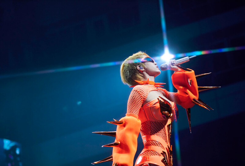 在充滿驚喜之餘更把怪美時尚指數提升至天花板等級,吸睛程度相較過去17場有過之而無不及!其中開場以「惡之女王」形象登場的Jolin這次改披銀盔黑甲層次相間的「炫黑女帝」戰袍出征,緊接著又化身「腥紅蠍后」、「赤血狂花」、「銀河雅典娜」、「紫羅蘭蝴蝶芭比」、「裸鑽尤物」、「怪美舞孃」、「Ugly Beauty Heroine」的她令台下歌迷眼花撩亂目不暇給,再次感受到百變天后的強大氣場!