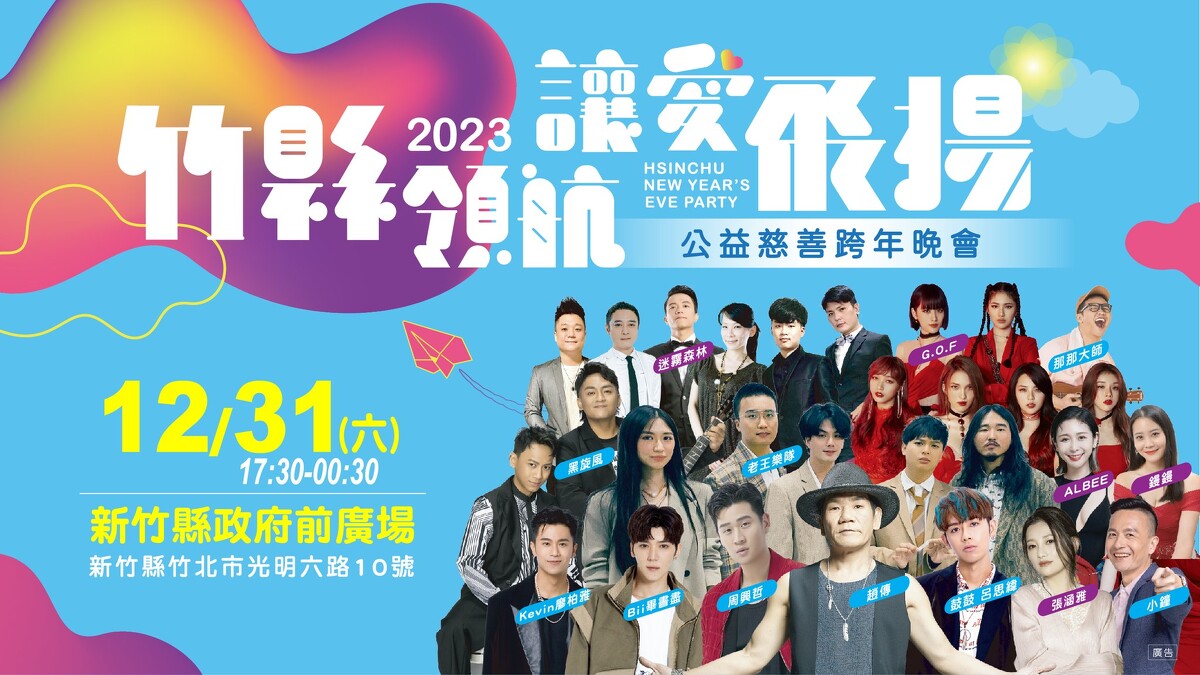 2023新竹縣公益慈善跨年晚會「竹縣領航 讓愛飛揚」,會由小鐘、Albee范乙霏、YouTuber那那大師、鏝鏝搭檔主持,而完整演唱會藝人卡司包含周興哲、Bii畢書盡、《菱格世代DD52》冠軍女團G.O.F、趙傳、鼓鼓、老王樂隊、張涵雅、廖柏雅、黑旋風、迷霧森林,用滿滿膾炙人口好歌陪伴大家。