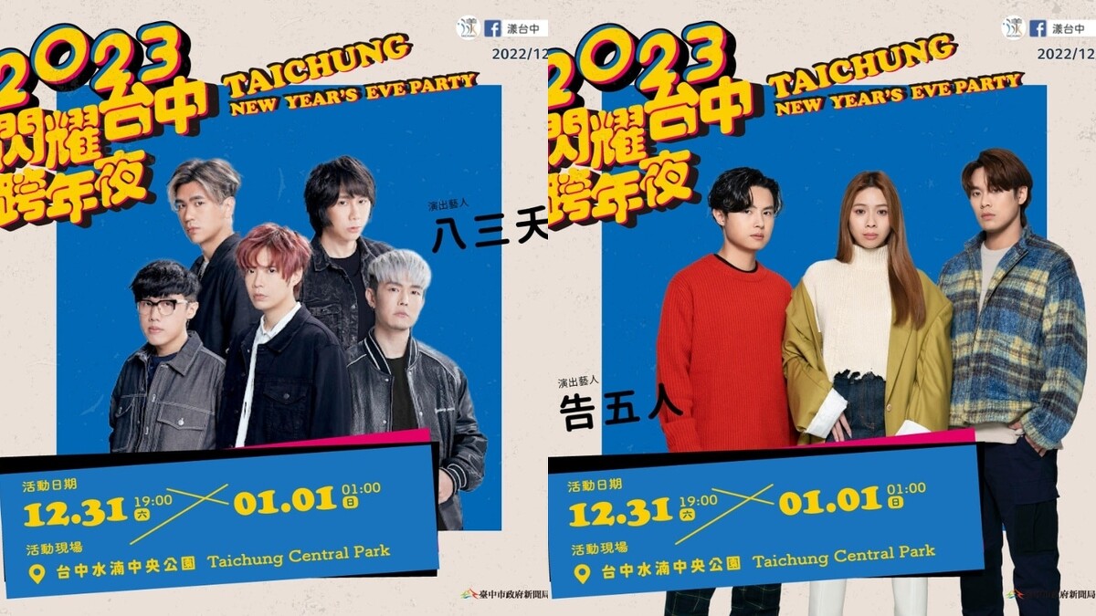 壓軸宣布跨年盛事的2023台中跨年,主打全台卡司最強、活動場地最廣、國際化最吸睛、煙火綻放最美等4大特色,卡司有周興哲、原子少年天王星、韓國音樂才子SHAUN、八三夭、Bii畢書盡、林宥嘉、閻奕格等超過20組藝人樂團,從快歌到情歌通通有,活動長達6小時。