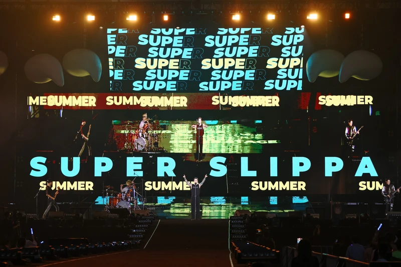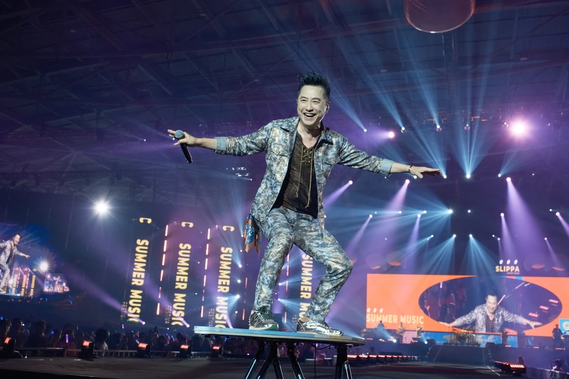 說和唱一樣好聽的五月天壓軸登場,最特別是他們將舞台佈置成夏日風情的泳池派對,要與觀眾清涼一夏。一開場五人穿著黑色西裝演唱〈傷心的人別聽慢歌〉霸氣登場,但今天他們手上不是拿樂器,而是拿金色排球,怪獸跟台下觀眾打招呼也笑說:「我是沒有吉他的吉他手怪獸。」團員接連打趣笑稱沒拿樂器就像「裸體」。