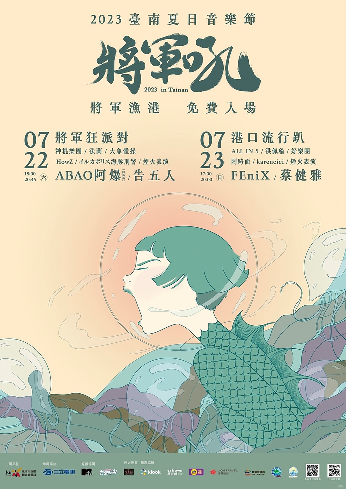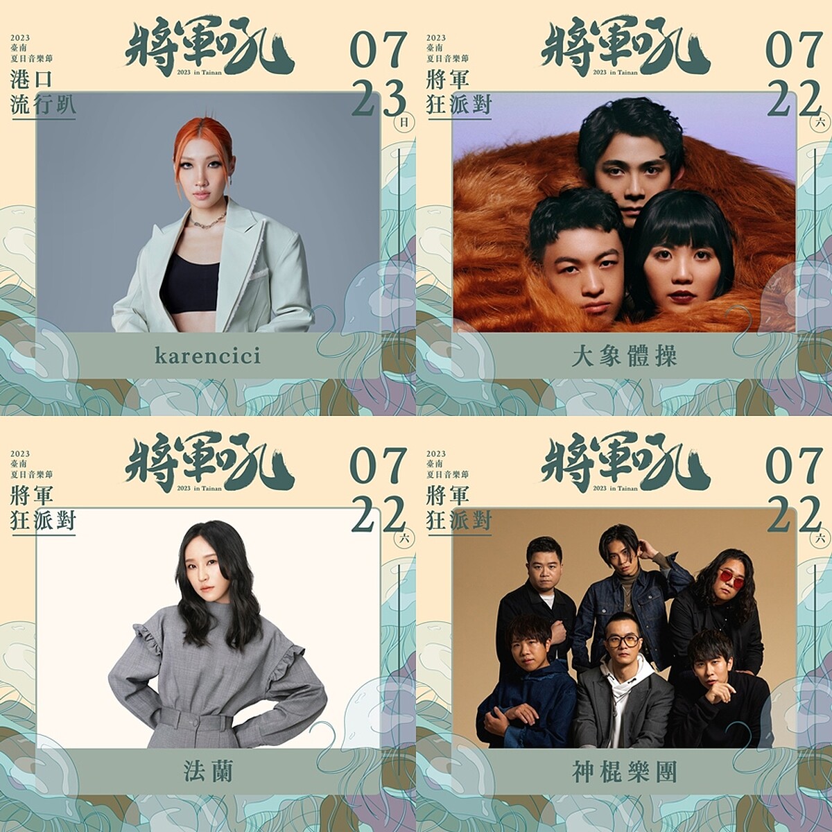 其他亮點陣容還有奪下選秀《大嘻哈時代2》總決賽冠軍的台南在地歌手並阿跨面、大勢樂團告五人、2023金曲獎入圍大贏家洪佩瑜。而在兩天分為不同主題:「將軍狂派對」、「港口流行趴」,在兩場演出結束後,更會施放共4萬發的璀璨煙火秀,在這裡吹海風、吃海鮮、聽音樂、看夏日花火,留下別於以往的台南回憶。