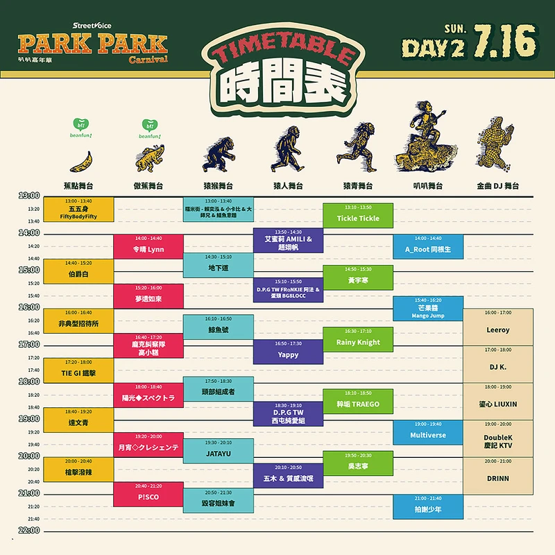 今年的「Park Park Carnival 叭叭嘉年華」分七個舞台,其中最大的叭叭舞台特地安排了嘻哈組合和流行樂團,由入圍金曲最佳新人的潮州土狗(+禁藥王x栗子)及鶴The Crane 開啟首日7/15的演出。以專輯《邊緣轉生術》入圍金曲四項大獎的 A_Root 同根生和入圍最佳新人的芒果醬則擔綱第二日的表演。