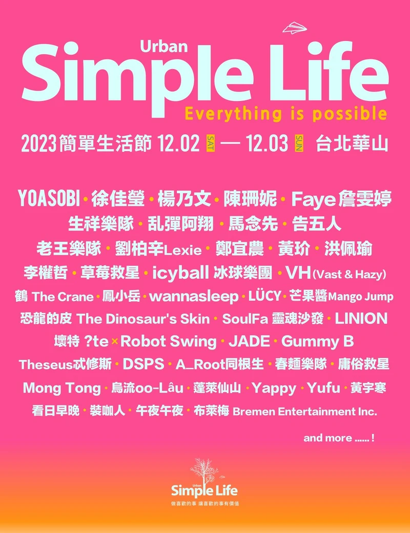 「2023簡單生活節」完整表演嘉賓名單如下,售票資訊將於近日公開!
