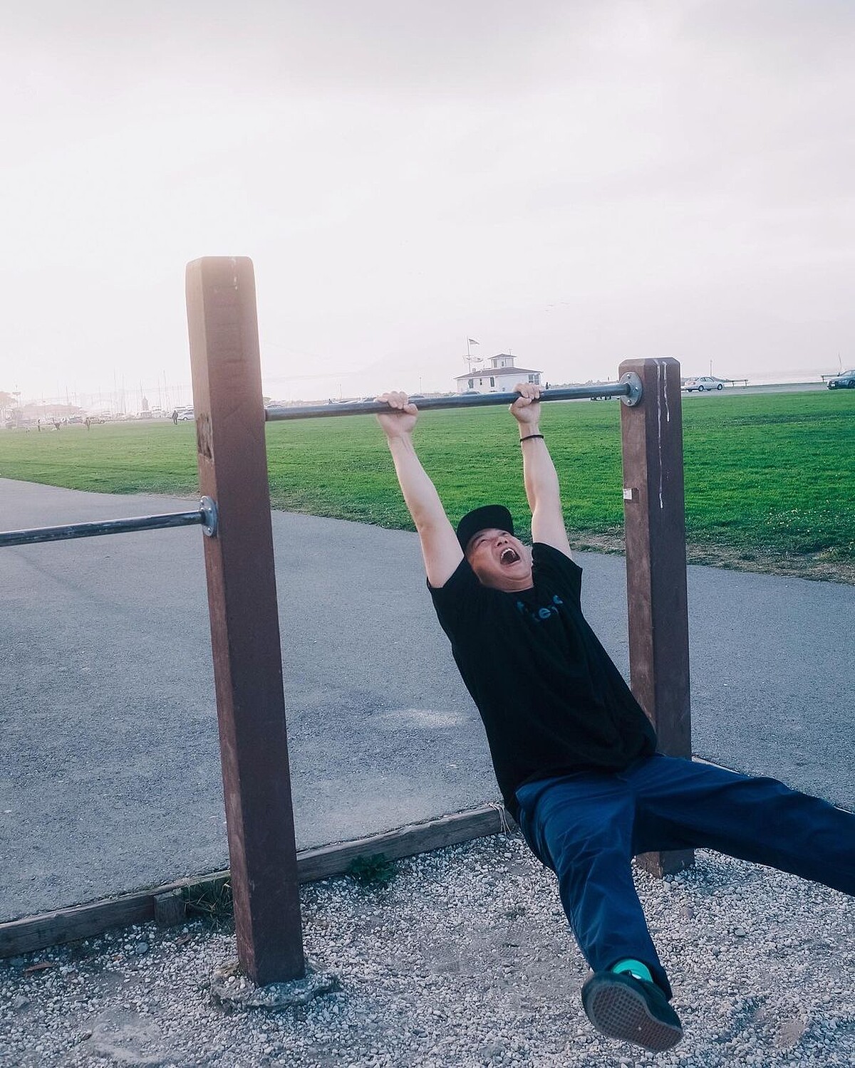 除了帶引出我們無時無刻應保持童年時最無憂無慮之初心外,Michael Lau設計《CHIN UP!》封面時還加入了一些巧妙,例如:將封面逆時針轉90度,攀爬架會形成「E」字,代表 Eason;封面底部有9片彩雲,靈感來自英文諺語「on cloud nine」,即一種快樂到頂點的狀態,周遭環境變遷也能樂觀面對。而專輯頂部的星形吊燈不單純是點綴,當中寓意大家「shoot for the stars」,邁步向夢想進發。