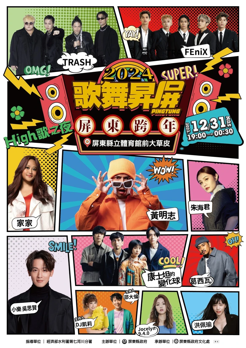 各地跨年晚會陸續公開,屏東縣政府搶在12月前就宣布,完整卡司包含創作鬼才黃明志、人氣樂團康士坦的變化球、龐克搖滾樂團TRASH、小樂吳思賢、「靈魂歌姬」家家、人氣男團FEniX、金曲最佳新人洪佩瑜、原民歌王葛西瓦、金曲歌后朱海君、R&B小辣椒Jocelyn 9.4.0,帶來長達5小時不間斷的熱力音樂派對。