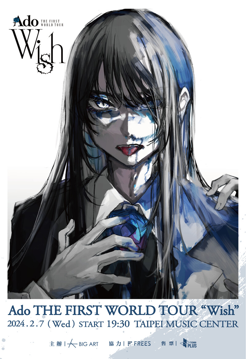 Ado出道三年這次世界巡迴演唱會標題取名為「Wish」,將前往包括亞洲、歐洲、美國等共計14個城市演出。台北站確定要在2月7日(三)登場,除了是台北流行音樂中心成立後、該場地第一位舉辦單獨演唱會的日本女歌手,屆時可望將出道以來的所有夯曲一網打盡,親身體驗超越吞CD等級的Ado演唱會!Ado世界巡迴演唱會台北站將於2月7日星期三晚間19點30分在台北流行音樂中心開唱,票價為NT$ 4,900、NT$ 3,900、NT$ 2,900、身障席NT$ 1,900 等4種,門票預計12月23日(六) 12點在遠大售票系統開賣,一樓票種為搖滾站席,二、三樓為座席,更多相關詳情可洽主辦單位大鴻藝術官方臉書專頁。