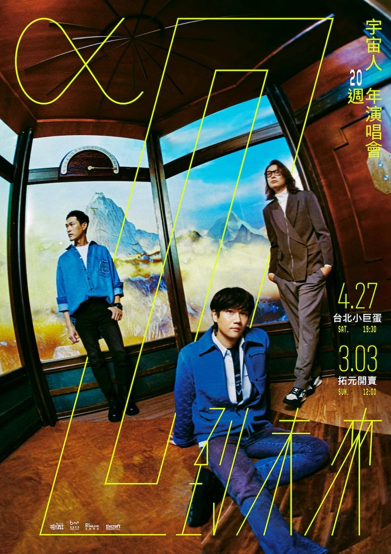 宇宙人在今年2024邁入成軍20週年,這20年來舉辦過上百場巡迴演唱會、跨足電影與配音、與藝術家合作展覽,更奪下金曲獎,希望這些年來的理想狀態,能一起回到未來,於4月27日登場。宇宙人公布20週年演唱會主題為【宇宙人《α:回到未來》20週年演唱會】,且大手筆在虛擬攝影棚打造1:1電梯實景拍攝,作為第一個登上喜馬拉雅山的華語樂團,宇宙人這次竟超現實搭電梯「重返」現場!