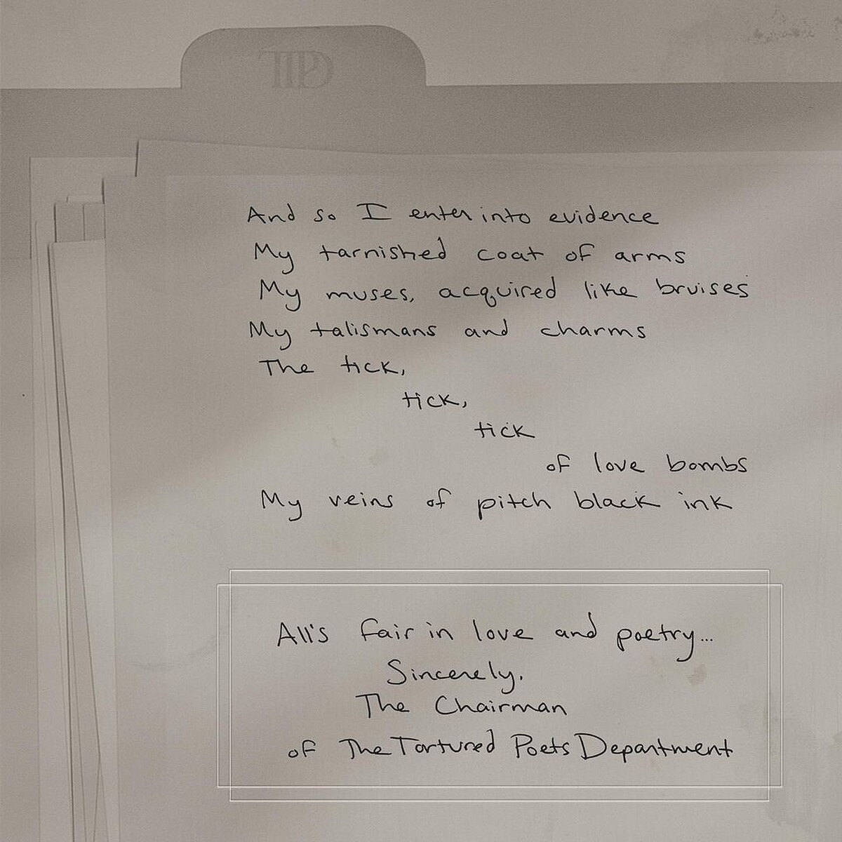 她的團隊也旋即公開了專輯封面和創作背景,「And So I enter into evidence my tarnished coat of arms my muses, acquired like bruises my talismans and charms. The tick, tick, tick of love bombs. My veins of pitch black ink.」專輯有著猶如疫情期間她推出的《folklore》、《evermore》,歌詞的文學性絕對是這張專輯的亮點。