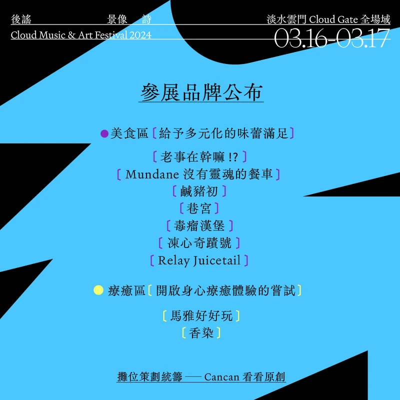 *美食攤位:啤酒肚釀製|Relay Juicetail|沒有靈魂的餐車|鹹豬初|巷宮|毒瘤漢堡|凍心奇蹟號|老事在幹嘛!?