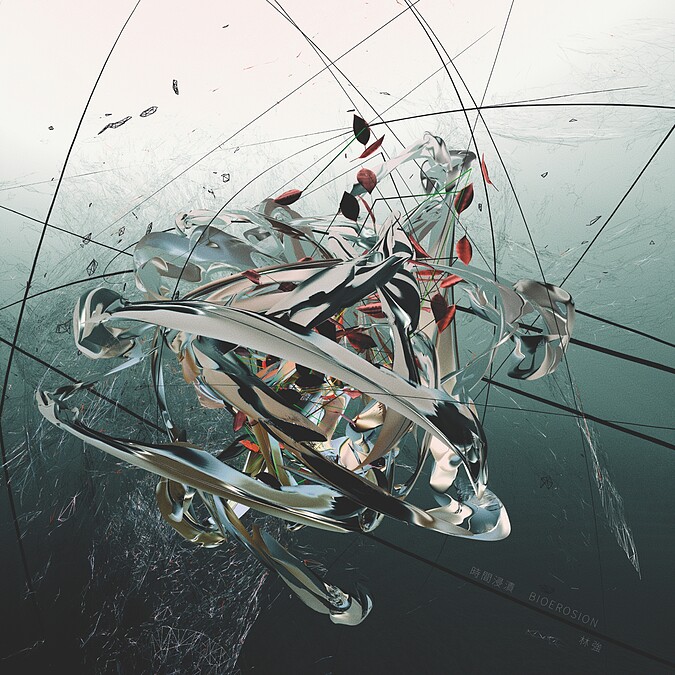 《時間浸漬 BIOEROSION》專輯封面由義大利藝術家 Luca Bonaccorsi 操刀設計。他在 2023 年獲得大墩美展數位藝術類第一名,並於同年 OCF 夏日派對上,透過即時編碼(live coding)創作電子音樂,展示獨樹一幟的藝術創作天份,備受矚目。今年,他再次受邀與林強合作,在「開源祭」上擔任林強《時間浸漬 BIOEROSION》作品的影像搭檔。此次合作不僅展示了兩位藝術家在音樂和視覺藝術上的創新融合,也為專輯注入了豐富的視覺層次。
