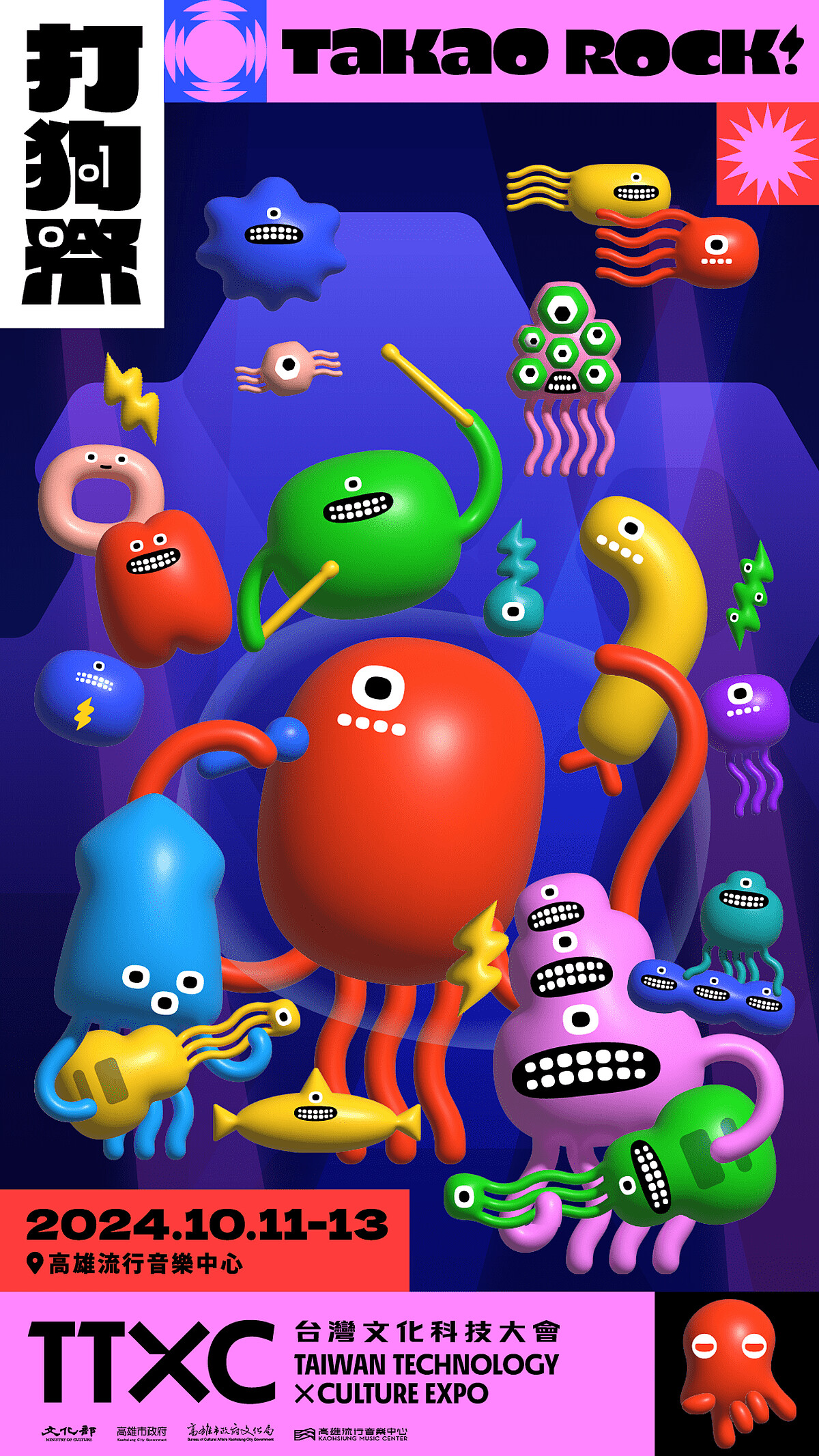 以「全民的音樂祭」、「聽團第一站」為定位的Takao Rock打狗祭,特別呼應今年「TTXC台灣文化科技大會」的科技主題、「多元音樂宇宙」概念,設計打狗祭IP「小怪獸」及社群AR動態濾鏡,另外更以超豪華卡司陣容讓早鳥票在短短6分鐘內秒殺一空,可說是10月最夯音樂祭之一!