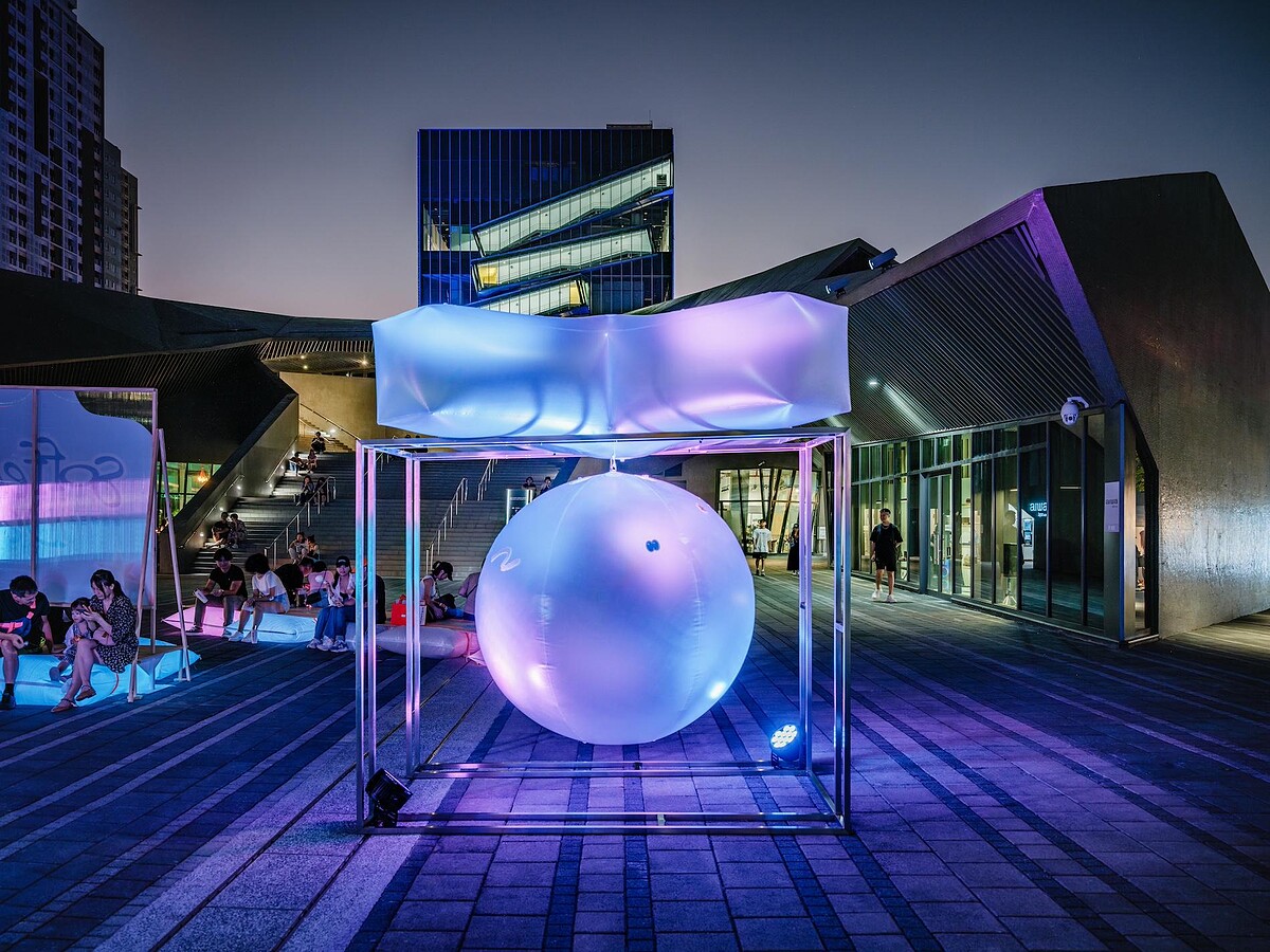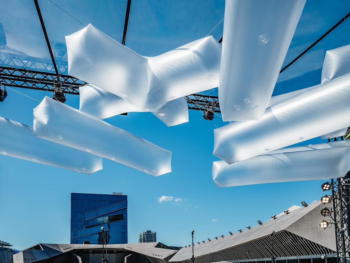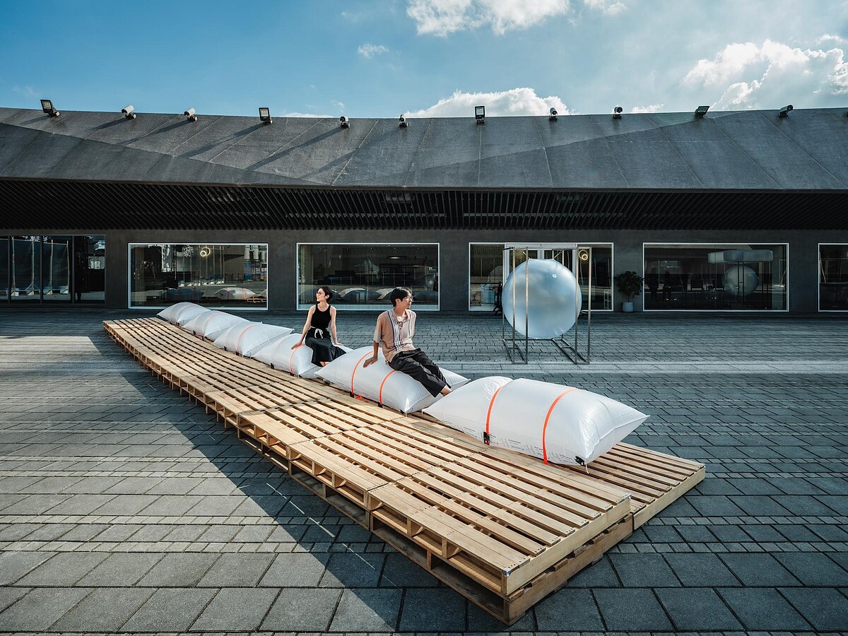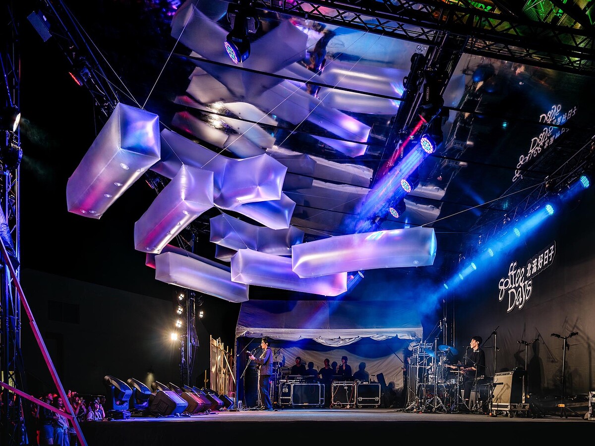 廣場上座位區設置可當成枕頭的充氣緩衝袋,看似蓬鬆卻具十足韌性的充氣袋,除了讓大家可以或坐或躺的聆聽音樂,也象徵著音樂能擴充身心的自由與彈性。充氣枕頭的設置,實踐「可以躺的音樂祭」的美夢。