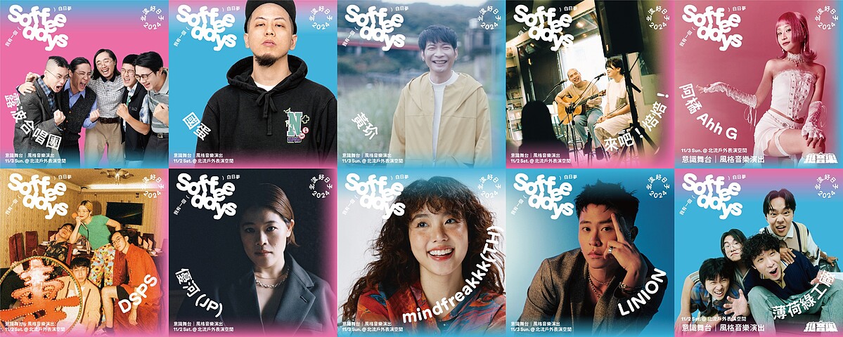 這次 Soffees Day 邀請 10 組台日韓人氣歌手登台,從 Jazz Hip Hop、R&B、Folk 到 Rock 等各種風格,讓周末在白日夢雲朵舞台中,跟著音樂進入繚繞、迷濛的白日夢境。
