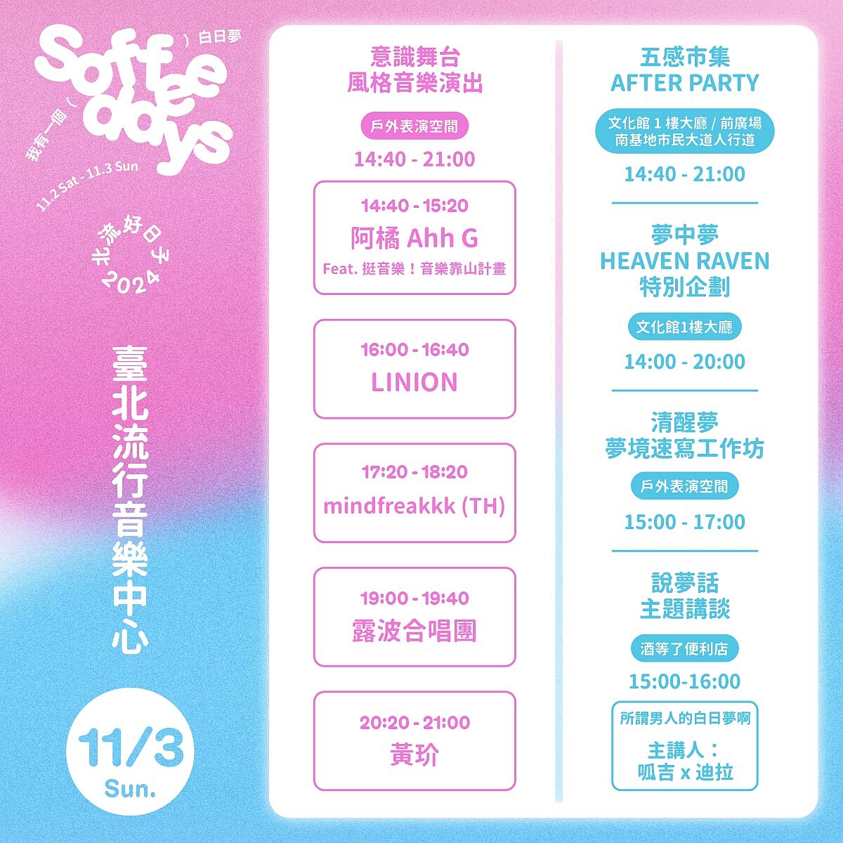 ☁︎ Day2 11.3 日☁︎ 14:40 - 21:00 阿橘AhhG ft.挺音樂!音樂靠山計畫、LINION、mindfreakkk(泰國)、露波合唱團、黃玠