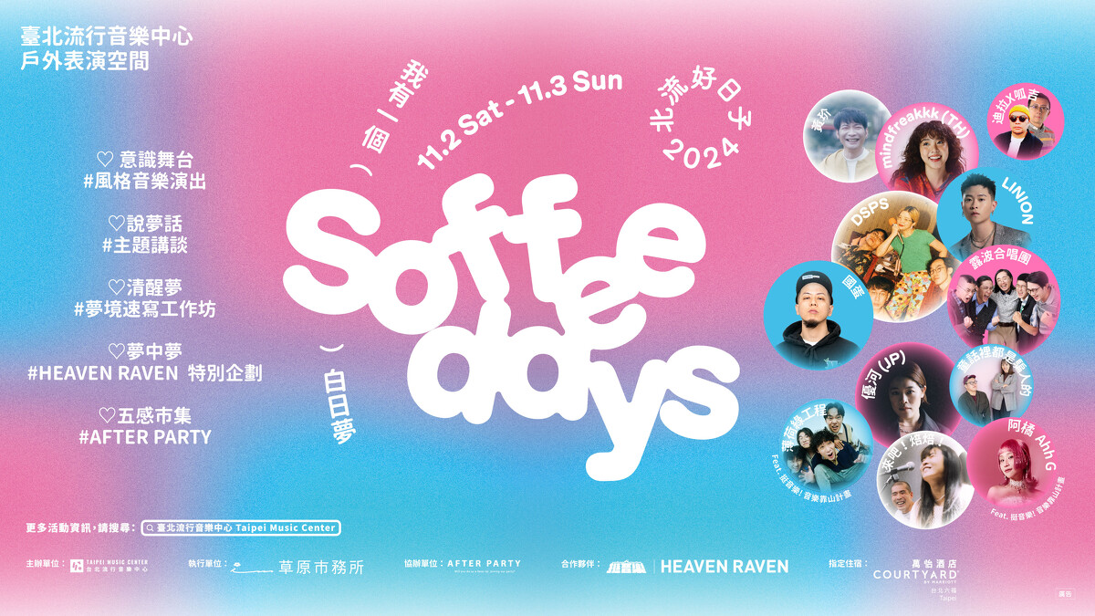 臺北流行音樂中心(北流)主辦的第二屆「Soffee Days 北流好日子」,本周末(11/2、11/3)即將在北流園區夢幻登場。今年由擅長空間設計的草原市務所策劃,以「白日夢」為活動主軸,集結共 10 組台日泰知名音樂人,從空間敘事到音樂內容企劃,打造屬於北流的城市音樂新品牌。