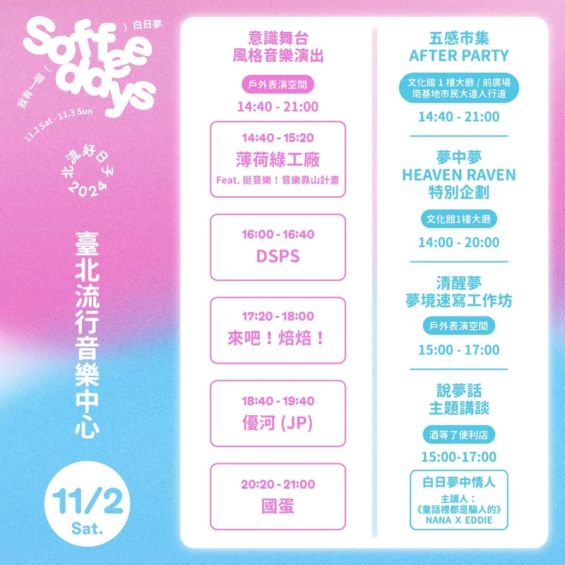 ☁︎ Day1 11.2 六 ☁︎ 14:40 - 21:00 薄荷綠工廠 ft.挺音樂!音樂靠山計畫、DSPS、來吧!焙焙!、優河 YUGA (日本)、國蛋