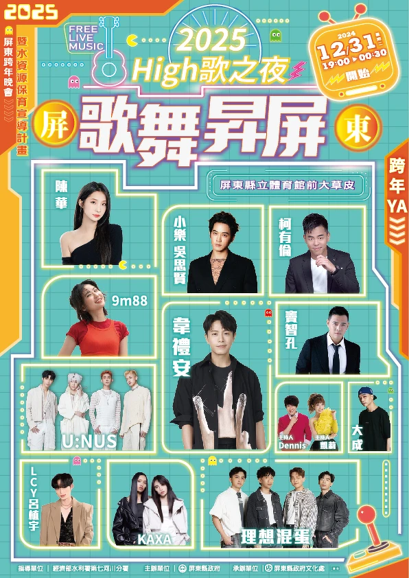 延續「2024屏東聖誕節」熱潮,「2025屏東跨年演唱會」主題訂為「2025歌舞昇屏 High歌之夜」,總共邀請11組歌手,最大咖是常常入圍金曲獎的情歌王子韋禮安,會以溫柔嗓音帶來獨家演出,陪伴粉絲邁向璀璨2025年!其他卡司包含理想混蛋、9m88、U:NUS、陳華、小樂 吳思賢、柯有倫及竇智孔首次跨年合體、創作歌手呂植宇、新生代雙人組合KAXA、嘻哈新生代大成DACHENG。