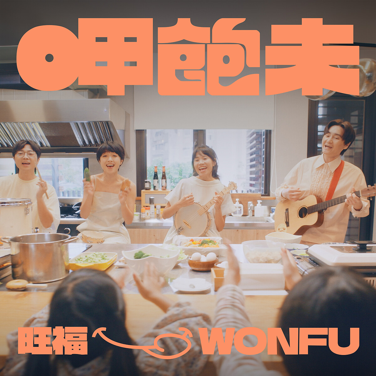 〈呷飽未〉MV 由擁有獨特女性視角的影像導演林之語拍攝,為了能跟歌曲創作初衷有更深的連結,特別找來好幾位過去曾受樂扶基金會照顧的孩童參與主演。這些孩子們的親身經歷不僅讓歌曲更具意義,他們也跟著旺福樂團一起挑戰料理各種美食。難得能和這麼多小朋友一起做菜,旺福四位成員玩得不亦樂乎,從備料到挑選食材,再合力烹調,最後終於把美食端上桌,豐盛又澎湃,根本就是提前圍爐!成員們笑說:「原本只是想和這群小朋友拍攝簡單的做菜畫面,結果四個人都不服輸!每個人都拿出好手藝,拼命程度簡直就像我們要開一間餐廳,正在試營運。」