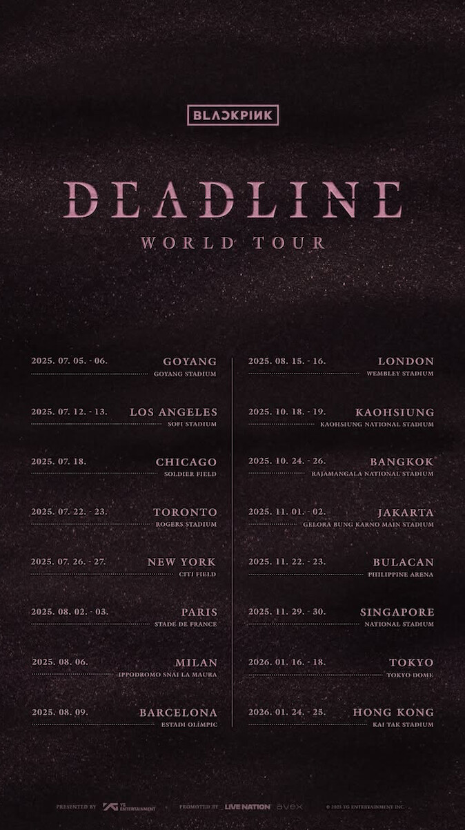 BLACKPINK演唱會2025倒數中,演唱會名稱為「DEADLINE WORLD TOUR」,更被許多網友稱為將是「里程碑級演出」,巡演將會從7月5日起從韓國高陽市正式啟動,歷經亞洲、北美、歐洲等地,壓軸場則訂於2026年1月25日於香港落幕,更驚喜宣布將在2025年10月二登高雄演出。