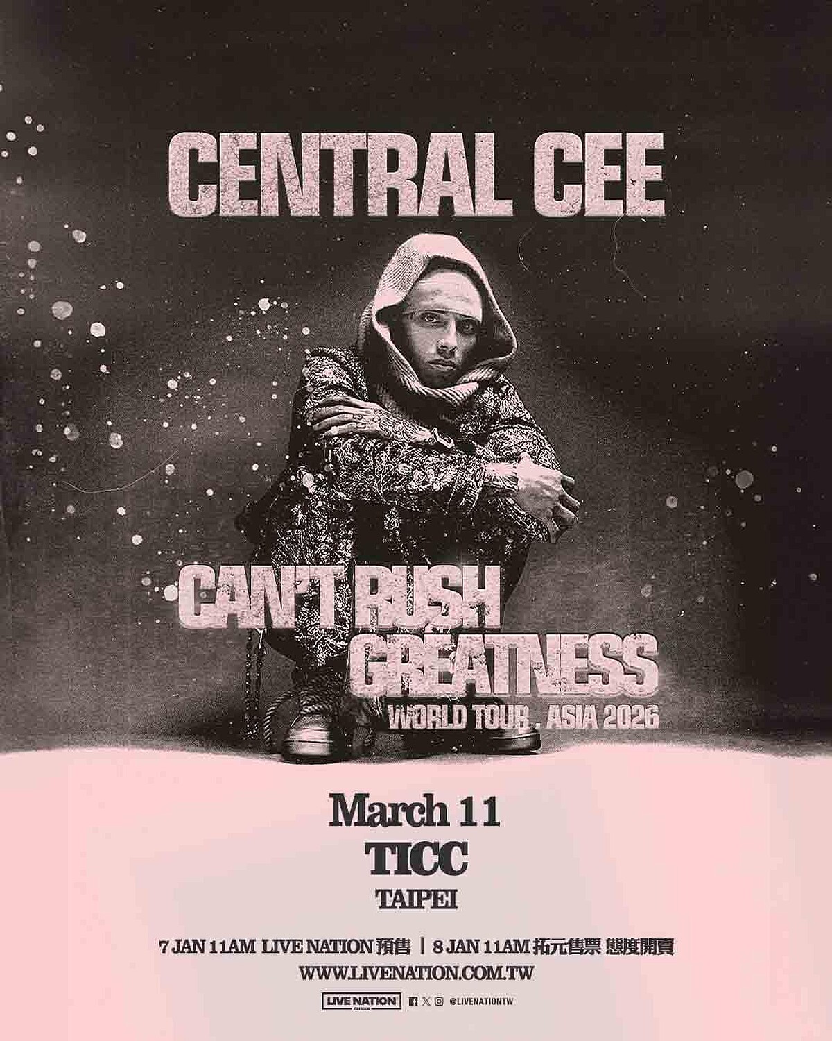而他的世界巡迴《CAN’T RUSH GREATNESS WORLD TOUR – Asia 2026》即將佔領亞洲各大城市,橫跨香港、首爾、馬尼拉,並確定於3月11日登上台北 TICC,這次巡演讓等待已久的樂迷驚喜不已,Central Cee終於要以「完整專場」形式強勢登台。