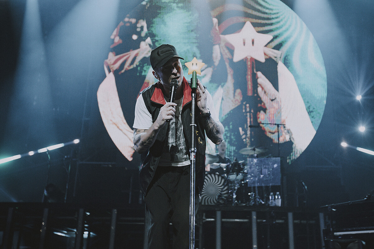 演唱會⼀開場,主唱 Ryan Tedder 驚喜⾝穿特製「萊恩款」宮廟背⼼登場,隨著節奏感爆棚的〈Born〉震撼揭幕,⾦⾊彩帶瞬間狂噴,全場氣氛直衝最⾼點。緊接著〈Secrets〉、〈Run〉、〈Stop And Stare〉等多⾸破億神曲連發,⾸⾸引爆全場⼤合唱,讓萬⼈徹底沉浸在 OneRepublic 的⾳樂魅⼒之中。唱到〈RUNAWAY〉時,更即興將歌詞改為「My friends in ⾼雄 they don’t know…」,瞬間點燃現場情緒,引來全場尖叫。