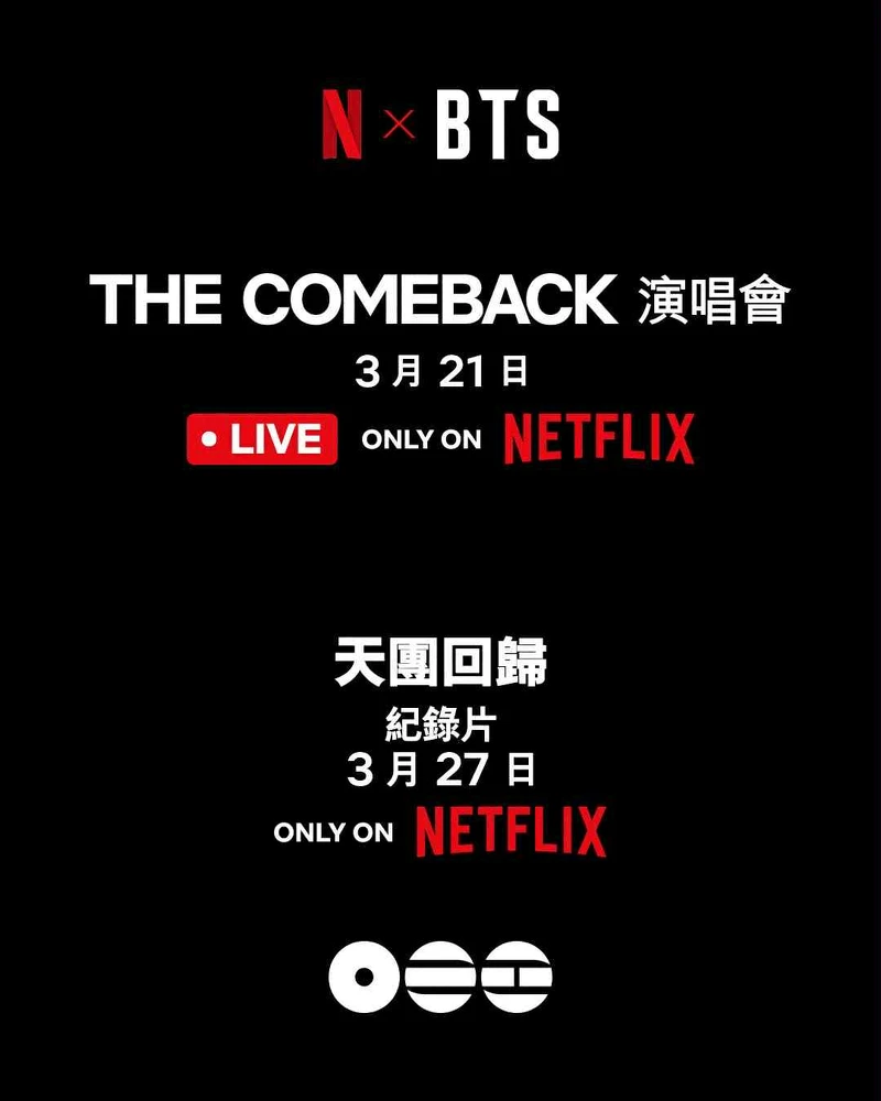 全球的ARMY注意,Netflix最新宣布將於3月21日台灣時間晚間7點(韓國時間晚間8點),獨家全球同步直播BTS演唱會《BTS THE COMEBACK 演唱會 | ARIRANG》,防彈少年團BTS成員RM、Jin、SUGA、j-hope、Jimin、V與Jung Kook將於退伍後首次以完整陣容舉辦現場回歸演出。