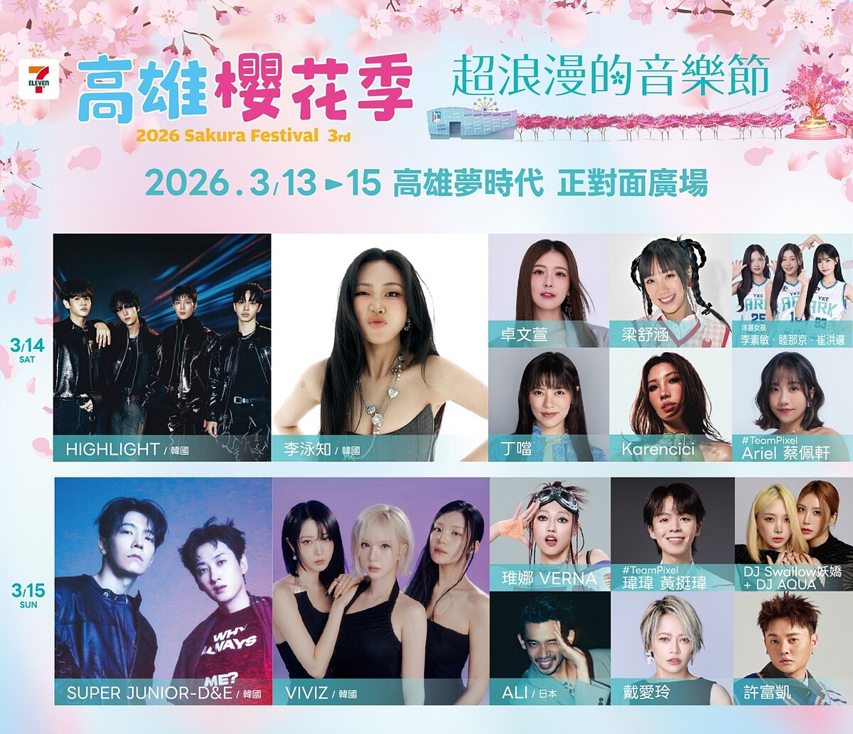 隨著春日氣息漸濃,南台灣最受矚目的音樂盛典也即將浪漫回歸。由7-11主辦的「2026高雄櫻花季音樂節」,將於3/13~3/15在高雄夢時代前廣場盛大舉行。今年卡司集結BOYNEXTDOOR、SUPER JUNIOR-D&E、HIGHLIGHT、李泳知等超過6組韓流巨星,以及日本超人氣樂團ALI與超過10組台灣實力派歌手接力登場演出,準備迎接這場橫跨台、韓、日的春季音樂饗宴。