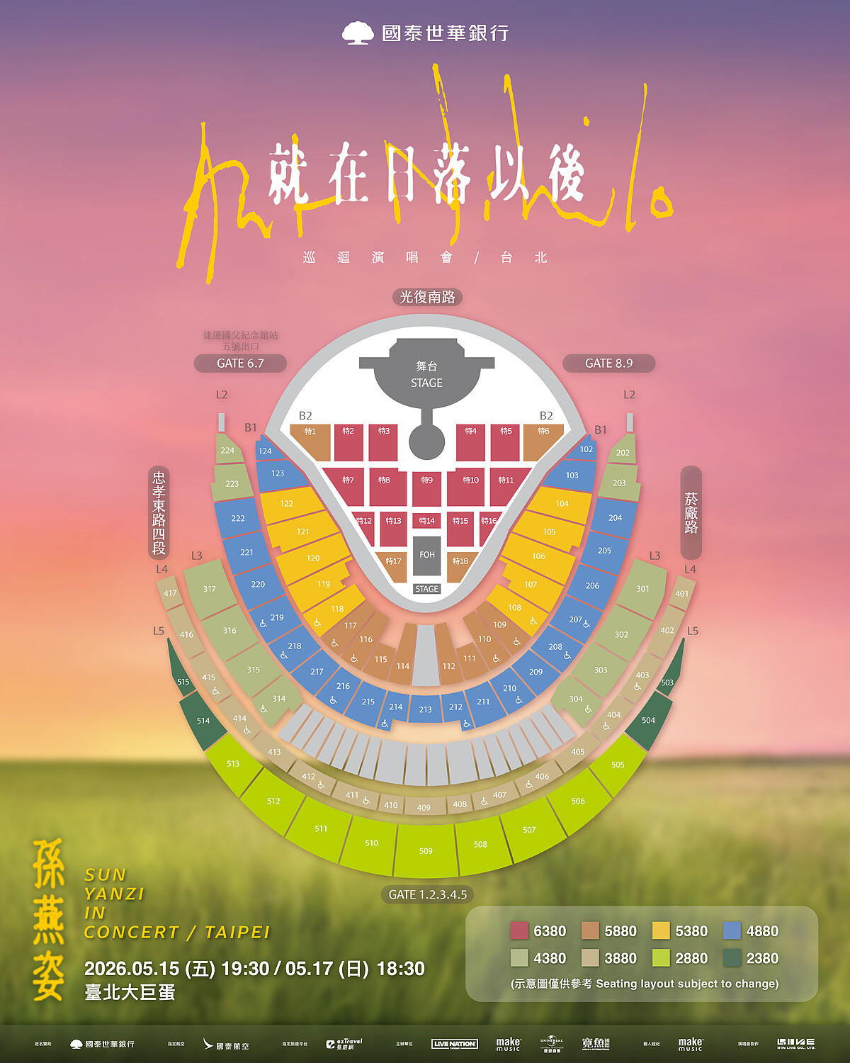 國泰世華銀行 孫燕姿 《就在日落以後》巡迴演唱會 – 台北,將於5月15、5月17日一連兩天開唱,這也是她出道以來首度在大巨蛋開唱,燕姿表示:「5月15、17日我將帶著《就在日落以後》巡演來到臺北大巨蛋,期待到時候和你們見面!」燕姿與導演及製作團隊緊鑼密鼓籌備,反覆推敲節目結構、視覺調度與音樂層次,為即將演出的內容尋找更精準的節奏與重心。