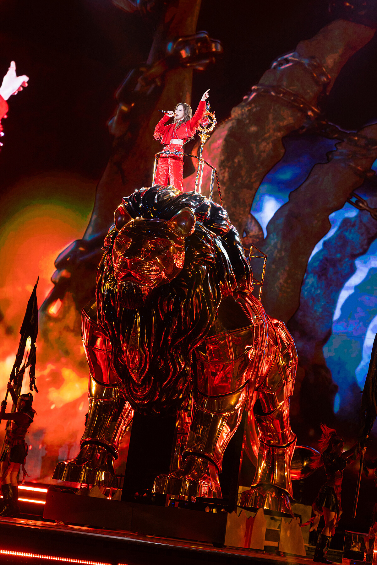 鄧紫棋演唱會開場即展現震撼的視覺體驗,全屏巨幕橫跨大巨蛋兩翼,磅礡聲響伴隨螢幕緩緩開啟,G.E.M.鄧紫棋以女王之姿踏上極具威嚴的「機械巨獅」登場,開場曲〈摩天動物園〉在交織的燈光矩陣中散發震懾人心的氣勢,瞬間點燃現場沸騰氣氛。是次演唱會採用全屏巨幕將視覺張力延伸至場館兩側,巨型 LED 不僅是影像載體,更是串聯整場演唱會敘事靈魂的核心;隨著每首曲目的編排,螢幕呈現出極具沉浸感的聲光包裹感,讓全場觀眾彷彿被捲入「GLORIA」的故事之中。