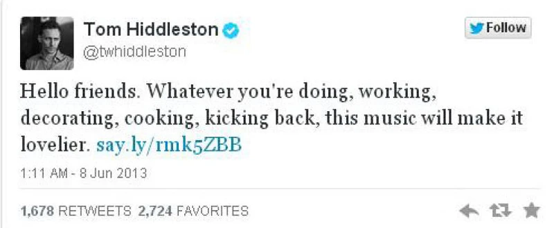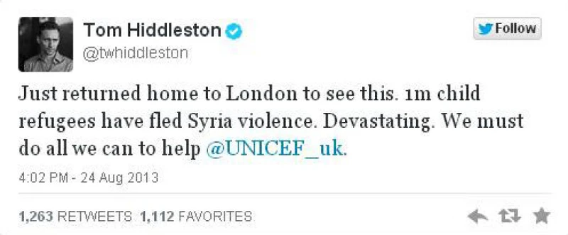 從他的Twitter帳號twhiddleston上面的發文我們可以發現,湯姆希德斯頓不僅與粉絲互動親切,更不時發文呼籲人道主義的重要。