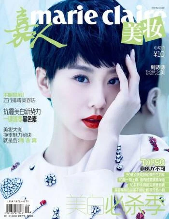 劉詩詩為即將出刊的三月號中國《嘉人美妝》拍攝封面,俐落短髮造型,整體清新自然,乾淨利爽的短髮依然驚豔美麗,讓人眼前一亮,紅唇與小清新的風格也並不矛盾,且帶著幾分活潑可愛的青春氣息,配上stella McCartney2014 Resort早春系列活潑青春的裙子,整個封面透著一股迷人的氣息!