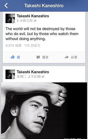 2014反黑箱服貿的行動越演越烈,許多藝人也陸續關注此事,藝人五月天、張懸、曾沛慈、李佳豫、吳慷仁皆徹夜未眠,在社群網站上發聲力挺「反服貿」,向來注重隱私的無敵男神金城武今稍早在臉書上放上一段愛因斯坦名句:「The world will not be destroyed by those who do evil, but by those who watch them without doing anything.(這世界不會被那些作惡多端的人毀滅,而是冷眼旁觀、選擇保持緘默的人。)」。